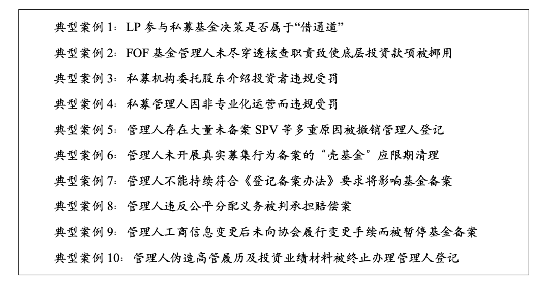 为此,根据2024年度以来基金业协会、地方证监局的处罚案例,以及前述动态和通讯,甚至法院的相关审判,我们总结了近年来十起典型案例,均系行业关注焦点,既有常见问题的深度再现,也有监管“首次认定”的风险类型,如“LP参与投委决策被定性为实质失职”“基金份额分配不公被判赔偿”等,对从业者具有制度级启示意义。笔者将深入剖析这些案例,期望帮助从业者精准把握监管动态,厘清登记备案环节中的关键审核要点,从而在实际操作中构建合规框架,规避潜在风险。
