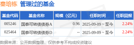 秦培栋先生:中国国籍,硕士研究生。2008年9月至2012年6月,就读同济大学经济与管理学院;2012年6月至2014年5月,任天治基金管理有限公司市场部高级渠道经理;2014年6月至今,任上海兴全睿众资产管理有限公司项目管理部项目经理。曾任职于天风证券股份有限公司研究所。2020年7月加入国泰基金,历任可转债研究员、高级可转债研究员、基金经理助理。于2018/12/27因换届辞去公司外部董事职务。2025年9月9日起任国泰可转债债券型证券投资基金基金经理。