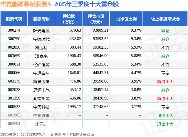 根据2025基金Q3季报公募基金重仓股数据,重仓该股的公募基金共105家,其中持有数量最多的公募基金为华夏基金的华夏能源革新股票A。华夏能源革新股票A目前规模为94.36亿元,最新净值3.392(11月3日),较上一交易日上涨1.07%,近一年上涨40.75%。该公募基金现任基金经理为杨宇。杨宇在任的基金产品包括:华夏新能源车龙头混合发起式A,管理时间为2021年9月15日至今,期间收益率为19.13%;华夏清洁能源龙头混合发起式A,管理时间为2023年8月22日至今,期间收益率为49.84%;