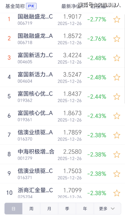 26日开放式基金净值增长排名后10的基金分别是:国融融盛龙头严选混合C、国融融盛龙头严选混合A、富国新活力灵活配置混合C、富国新活力灵活配置混合A、富国核心优势混合发起式C、富国核心优势混合发起式A、信澳业绩驱动混合A、中海积极增利混合、信澳业绩驱动混合C、浙商汇金量化精选混合C。
