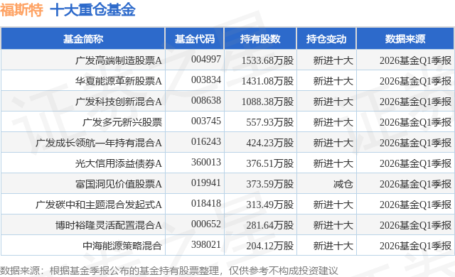 根据2026基金Q1季报公募基金重仓股数据,重仓该股的公募基金共29家,其中持有数量最多的公募基金为广发基金的广发高端制造股票A。广发高端制造股票A目前规模为36.87亿元,最新净值1.5992(4月24日),较上一交易日下跌0.42%,近一年上涨46.9%。该公募基金现任基金经理为郑澄然。郑澄然在任的基金产品包括:广发鑫享灵活配置混合A,管理时间为2020年5月20日至今,期间收益率为53.16%;广发兴诚混合A,管理时间为2021年1月6日至今,期间收益率为-49.43%;广发诚享混合A,管理时间为2021年2月8日至今,期间收益率为-44.67%。